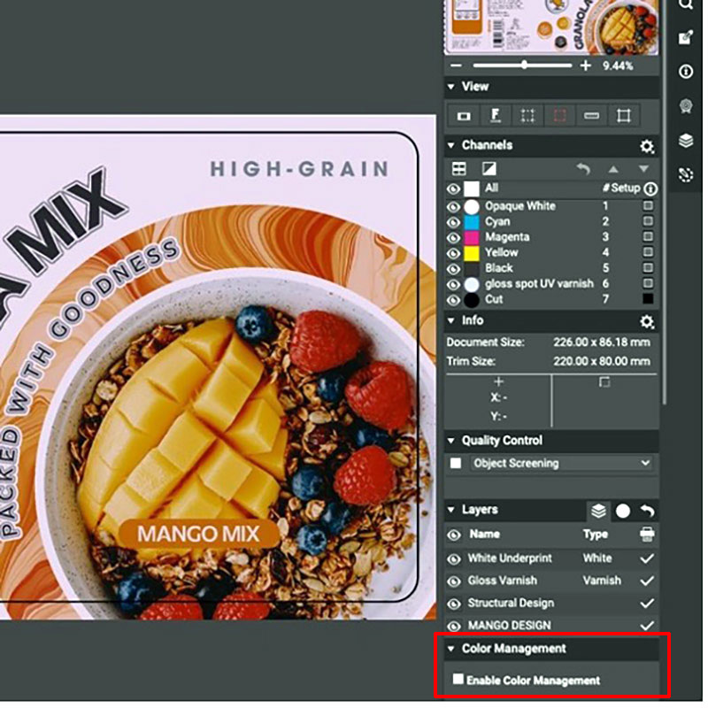- Simulate substrate color in the viewer to help QC/Prepress teams visualize the finished product, reducing time and energy spent on printing proofs.