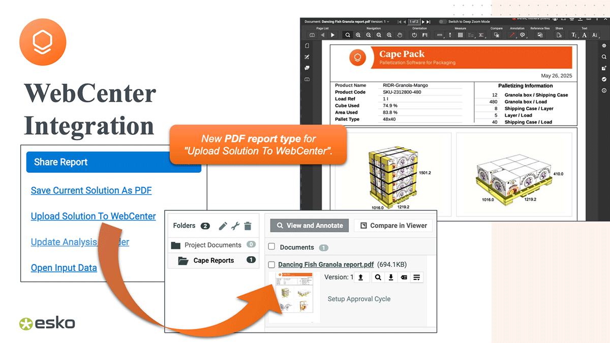 - Upload Cape reports as PDF documents directly into WebCenter. All Cape metadata is automatically mapped to WebCenter attributes for extended use.