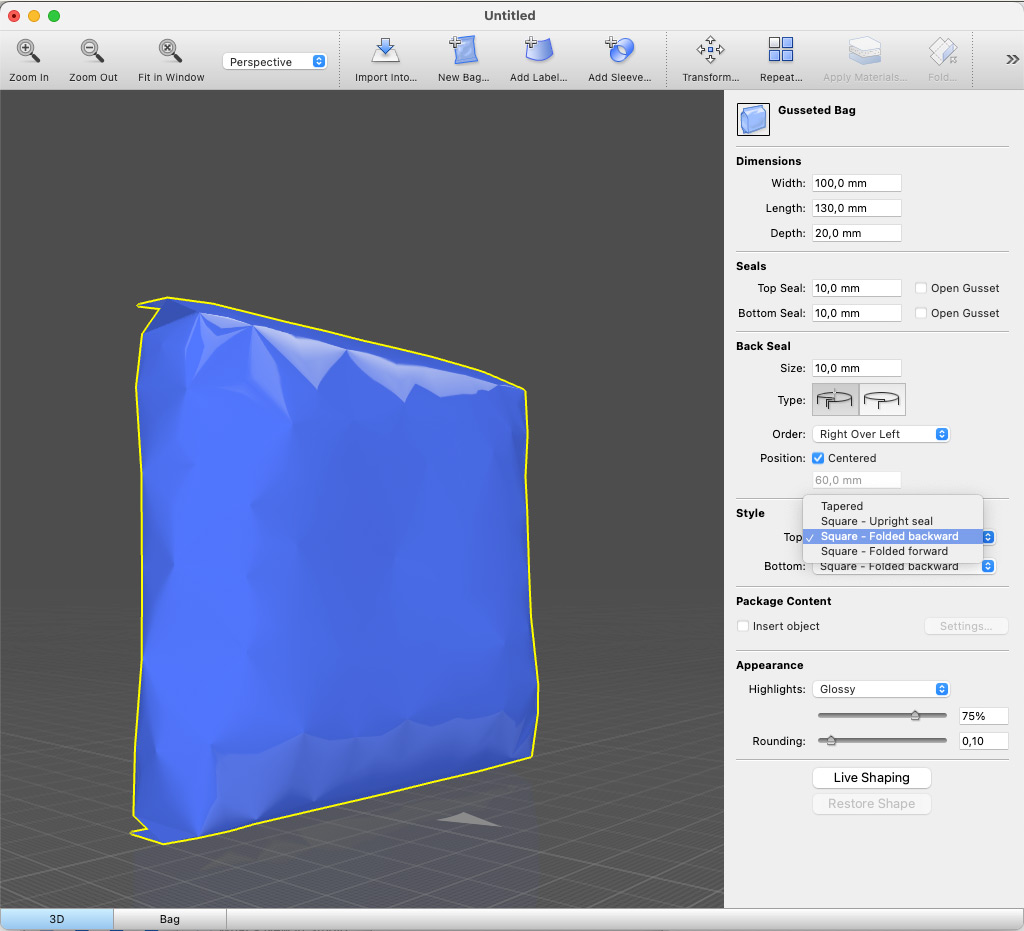 - Flattening the top and bottom seals on flexible bags using Studio Toolkit’s Live Shaping can be a tedious and manual process.