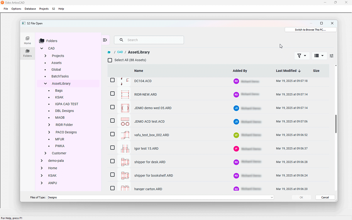 • Seamless Data Access: Save and open ArtiosCAD documents directly from S2, centralizing CAD data for easier access across connected products.