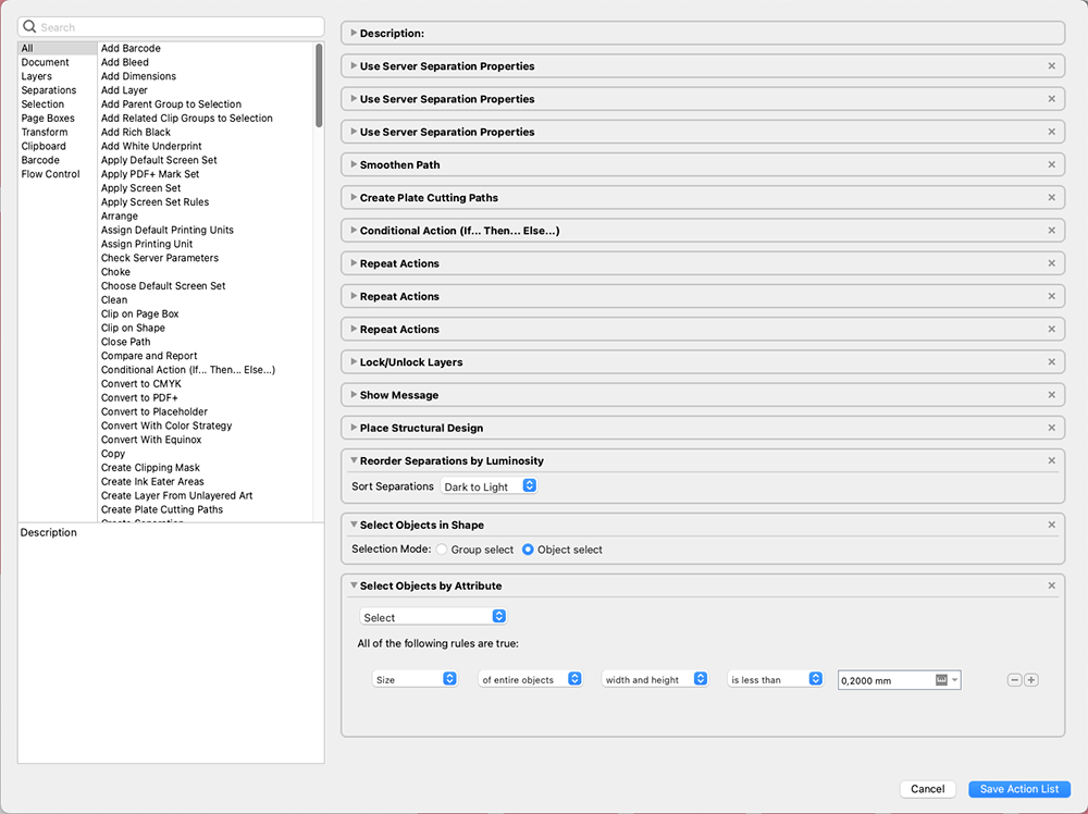 • New additions to PDF Action Lists allow operators to select objects by shape and size and reorder separations by luminosity (Sort Separations from lightest to darkest or vice versa. These automation-ready features reduce manual effort, improve ink management, and accelerate prepress productivity.