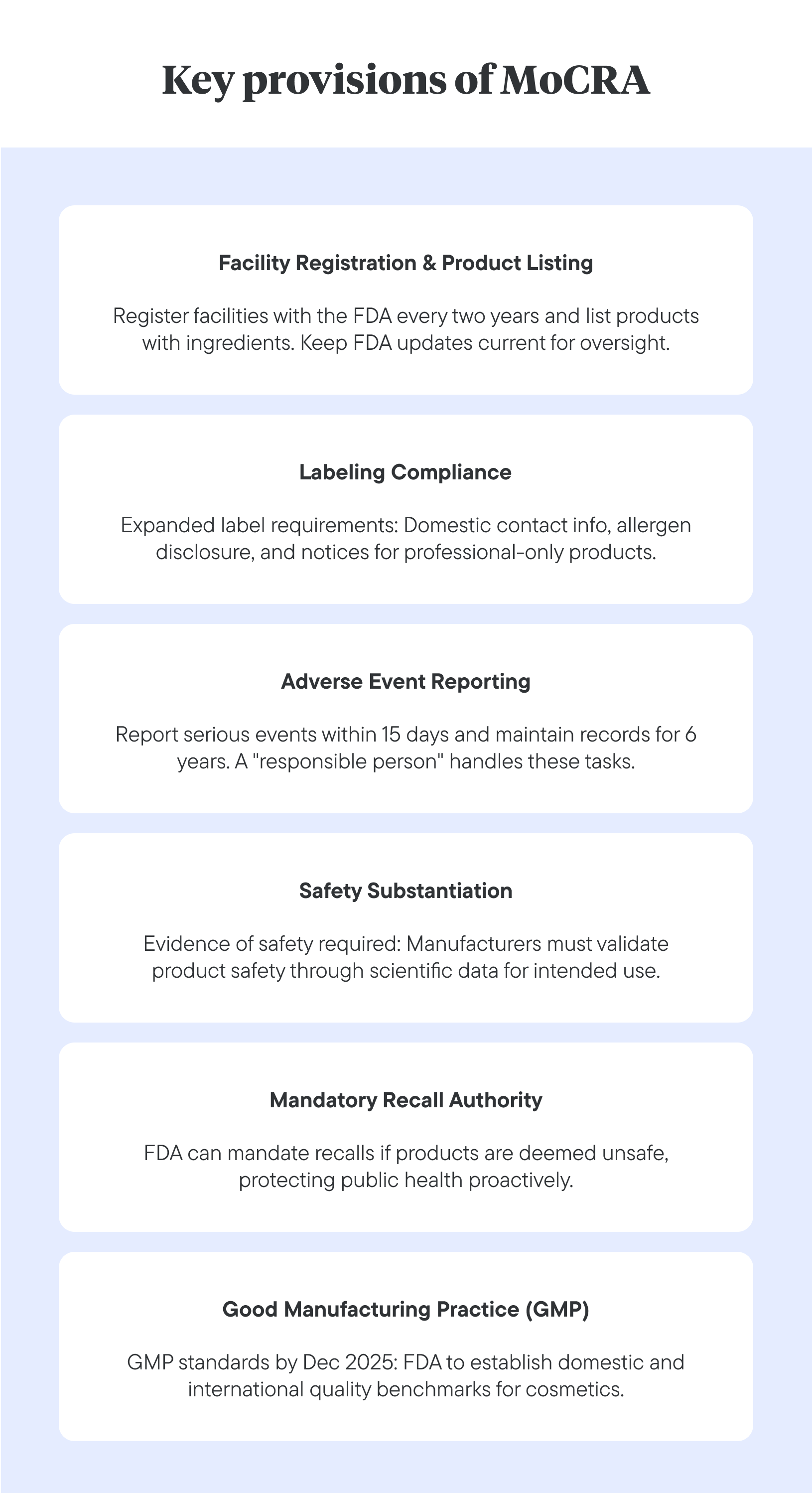 MoCRA defines specific requirements for the industry, such as facility registration, product listing, and labeling. This provides clarity for manufacturers and distributors, eliminating ambiguity about expectations and reducing the risk of unintentional non-compliance.