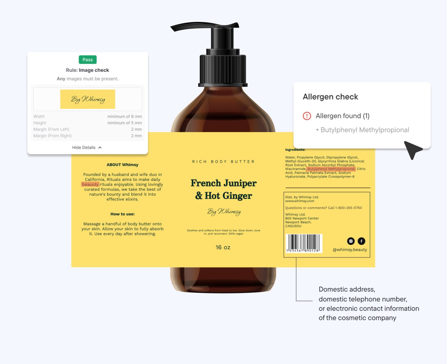 - Label review: Send out your cosmetic products without worrying about missing out on the domestic address, domestic telephone number, or electronic contact information of your cosmetic company on the label. Comply highlights if you’re missing this requirement.